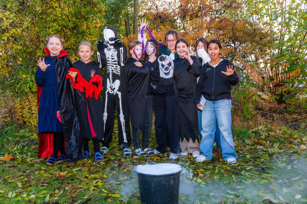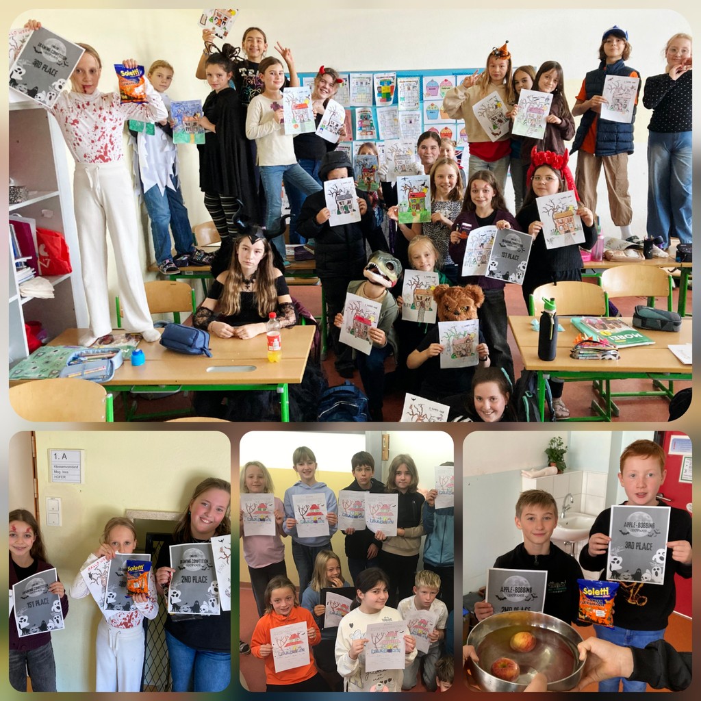 Als Basis wurden auch heuer in Englisch die irischen Wurzeln von Halloween ergründet, Halloweentraditionen recherchiert, Wortschatz kreativ erarbeitet, „spooky stories“ sowie Gedichte geschrieben und illustriert. Selbstverständliche durften „Winnie the Witch“, „Haunted Houses“ und ein Halloween Escape Room Abenteuer nicht fehlen. Unsere 3. Klassen erarbeiteten Oscar Wildes Klassiker „The Canterville Ghost“ von dem sie eine moderne Interpretation des „Vienna’s English Theatre“ sehen werden. Coole Halloweenparties zu planen, das Klassenzimmer zu dekorieren, sich aufwendig zu verkleiden, sowie die besten Kostüme und Geschicktesten beim „apple bobbing“ – einem traditionellen Halloween Spiel - zu prämieren, gehörte natürlich genauso dazu.