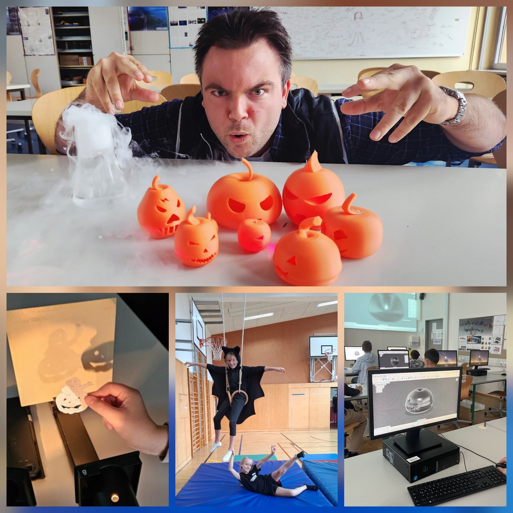In Physik und Chemie konnten unsere 3. und 4. Klassen ihr Wissen über Farbfilter in der Optik, chemische Reaktionen und Trockeneis bei kniffligen Spielen und Versuchen zeigen, sowie die ersten Klassen bei „Virus Ball“ und „Bat acrobatics“ in Bewegung und Sport ihre Geschicklichkeit unter Beweis stellen. Erstmals wurden in Geometrie mit dem 3D Modelliersoftwareprogramm Tinkercard und mit Fusion 360 Kürbisse am Computer konstruiert als 3D Modelle ausgedruckt.