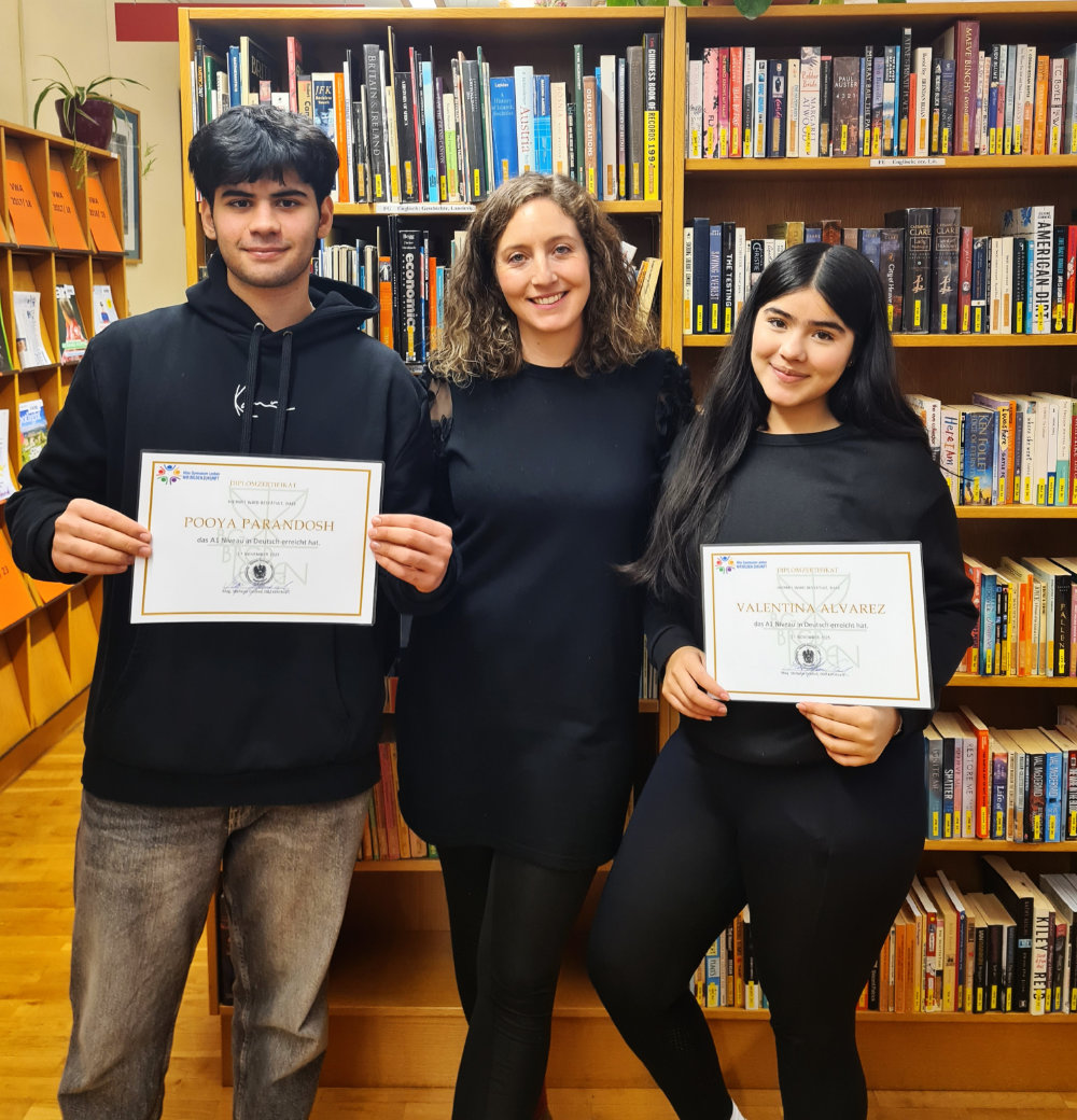 Pooya ist seit einem Jahr an unserer Schule, Valentina seit sechs Monaten. Beide zeigen beeindruckenden Fleiß und großes Engagement beim Deutschlernen. Sie bereichern unser Schulleben nicht nur durch ihre Motivation, sondern auch durch ihre offenen und freundlichen Persönlichkeiten.