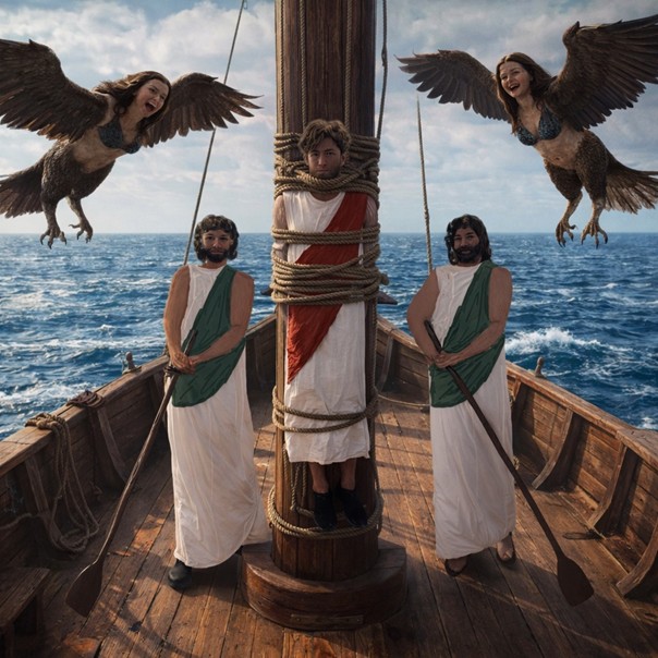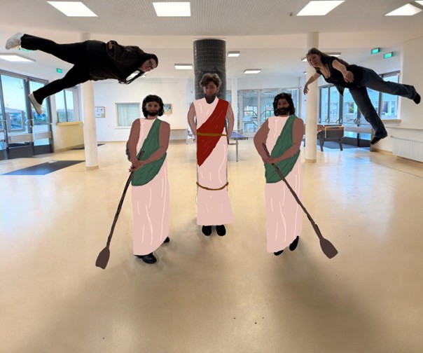 Als Mischwesen (Vogelfrauen oder Meerjungfrauen) versprechen sie Wissen und Weisheit, führen jedoch die Seefahrer durch Zerschellen an Felsen zum Tod. Nach dem Übersetzen haben wir über die Botschaft gesprochen, die der Autor Homer uns mitteilen wollte. Im Anschluss bekamen wir den Auftrag von Frau Professor Ferstl zu diesem Thema eine Fotostrecke mithilfe von KI zu erstellen. Als erstes haben wir von uns Fotos in richtiger Position geschossen und dann der KI den Auftrag gegeben, uns das Aussehen alter griechischer Seemänner zu verleihen. Es hat uns sehr viel Spaß gemacht, etwas Kreatives zu gestalten und gleichzeitig den Umgang mit der KI zu lernen.